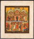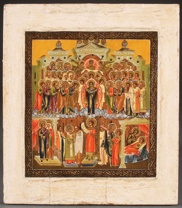 A RUSSIAN ICON OF THE POKROV MOTHER OF GOD, MSTERA, CIRCA 1900. A finely and colorfully rendered icon with ornately decorated kovcheg. The borders cleaned down to the gesso. 14.1 inches x 12.5 inches (36 x 32 cm).