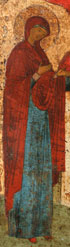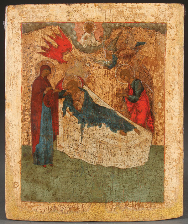 A RUSSIAN ICON OF THE UNSLEEPING EYE, 18TH CENTURY. Here Christ is shown as a youth lying on a bed, the Archangel Michael on his right, and on the left the Mother of God. An Angel hovers above Him, holding the implements of the Passion, and God the Father is shown at top center within the heavens. The "Unsleeping Eye" is based on Psalm 121:4, "Behold, he that keeps Israel shall neither slumber nor sleep." 12.5 inches x 10.5 inches (31.5 x 26.5 cm).