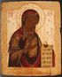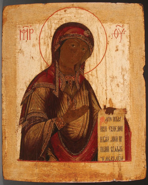 A RUSSIAN ICON OF THE MOTHER OF GOD, 18TH CENTURY. Here Mary holds a scroll and gestures toward her son Christ, likely from the left side of a three-piece diesis grouping. 17.6 inches x 14.8 inches (45 x 36.5 cm).