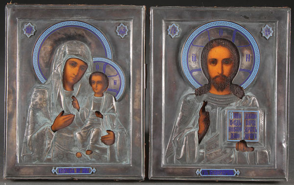 A PAIR OF RUSSIAN WEDDING ICONS, MOSCOW, 1908-1917. Comprising the Iverskaya Mother of God and Christ, who holds an open book of Gospels to John 13:34. Both realistically rendered and both overlaid with silver machine-engraved rizas with champlevé enameled haloes, title plaques, and Gospels text. Hallmarked Moscow, 1908-1917, indistinguishable maker's mark, perhaps "EA," and with 84 silver standard. 7.1 inches x 5.6 inches (18 x 14.5 cm).
