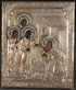 A RUSSIAN ICON OF THE APPEARANCE OF THE TRINITY TO THE VENERABLE ALEXANDER SVERSKIY. Fully painted and overlaid with a silver repoussé and chased riza with later added cloisonné enamel haloes. Stamped with 84 silver standard and Cyrillic maker's mark "VE." The painted panel second half of the 20th century. 8 inches x 6.5 inches (20 x 16.5 cm). (Unillustrated)