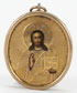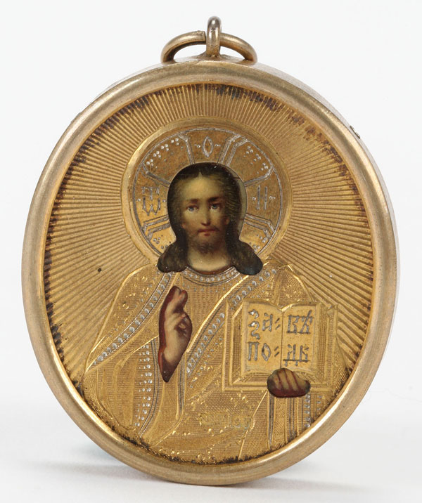 A RUSSIAN SILVER-GILT ICON PENDANT OF CHRIST, MOSCOW, 1908-1917. Contained within a silver-gilt oval frame with suspension loop at top, the naturalistically rendered image of Christ shown delivering a blessing and holding an open book of Gospels to John 13:34, and overlaid with a machine-engraved gilded silver riza. Hallmarked Moscow, 1908-1917, Cyrillic maker's mark "SG," and 84 silver standard. 2.1 inches (5.4 cm). (Unillustrated)