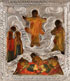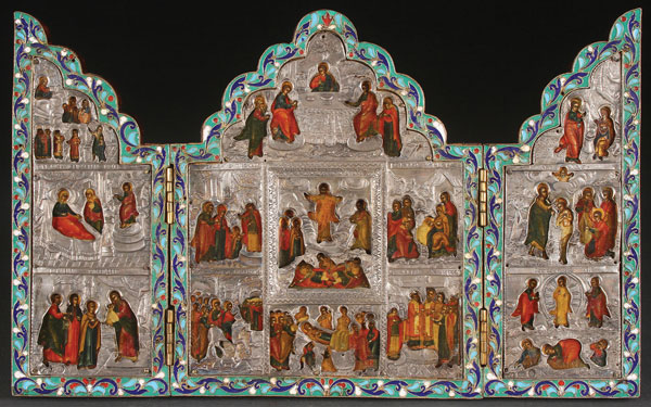A RUSSIAN ICON TRIPTYCH, ST. PETERSBURG, 1839. The central ogee arched shaped panel finely painted with the resurrected Christ at center, and surrounded by five images representing various Feast Days, and at top center, the Old Testament Trinity. The left and right wing also depicting various Feast Day imagery and all finely painted in the miniature technique. The entire image overlaid with a silver, repoussé, and chased riza. Hallmarked St. Petersburg, dated 1839, with Cyrillic maker's mark "AD," and 84 silver standard. Each panel framed in a border of cloisonné enamel, and set into a polished wood folding case. 8.6 inches x 14.1 inches (22 x 36 cm).