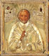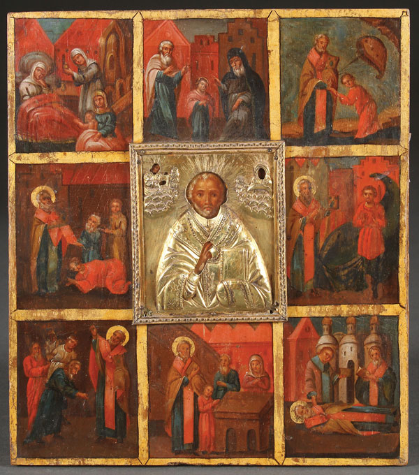 A RUSSIAN PRESENTATION ICON OF ST. NICHOLAS WITH LIFE SCENES, 1815. At center a waist-up image of St. Nicholas overlaid with a gilded silver repoussé riza and surrounded by eight scenes from the life of Nicholas. The verso with old dedicatory inscription dated September 22, 1815. 9.25 inches x 8.1 inches (23.5 x 20.5 cm).