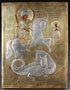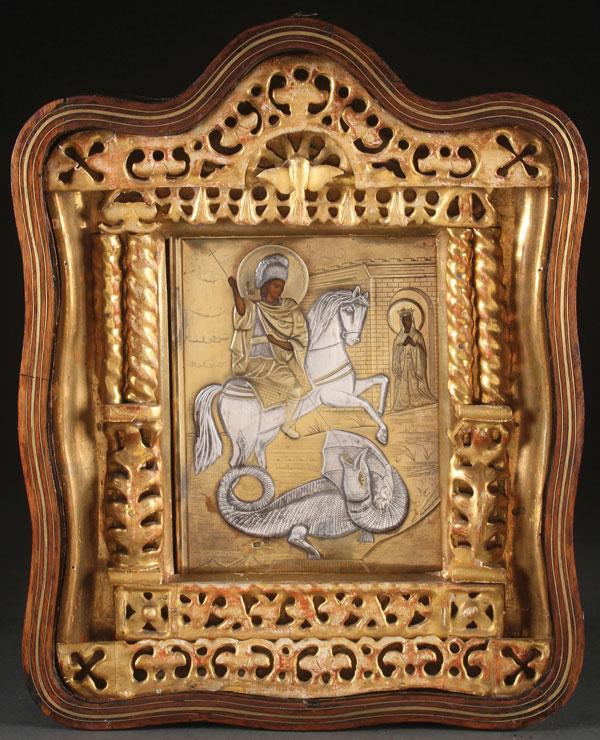 A RUSSIAN ICON OF ST. GEORGE SLAYING THE DRAGON, MOSCOW, 1908-1917. Naturalistically rendered, St. George slays the dragon beneath him as the Princess Elizabeth looks on. Overlaid with a machine-engraved silver gilt riza, hallmarked Moscow, Cyrillic maker's mark "D.U.," probably for Dimitry Udaltsov, and 84 silver standard. Contained in an ornate gilt frame set in a large shadow box (kiot). The icon 9 inches x 6.75 inches (22.5 x 17.4 cm).