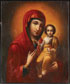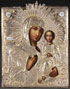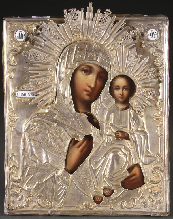 A RUSSIAN ICON OF THE SMOLENSK MOTHER OF GOD, MOSCOW, DATED 1854. Painted in the Italianate style and overlaid with a Rococo style silver-gilt repoussé and chased riza with painted porcelain title plaques. The riza and halo hallmarked Moscow and dated 1854. Cyrillic maker's mark "AF," and 84 silver standard. 10.75 inches x 9 inches (27 x 23 cm).