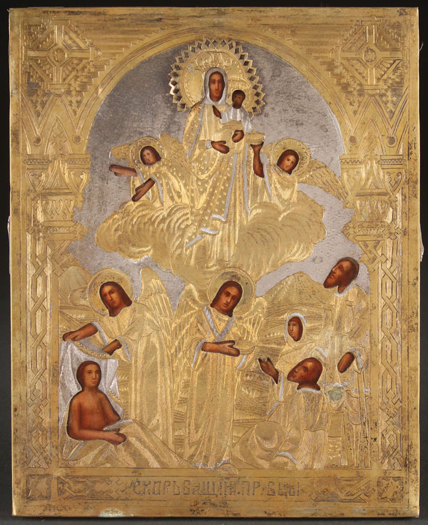 A RUSSIAN ICON OF THE MOTHER OF GOD JOY TO ALL WHO SORROW, CIRCA 1900. Realistically rendered and overlaid with an extensively machine-engraved silver-gilt riza. Hallmarked Moscow, 1908-1917, and 84 silver standard. 8.75 inches x 7 inches (22.3 x 18 cm).