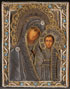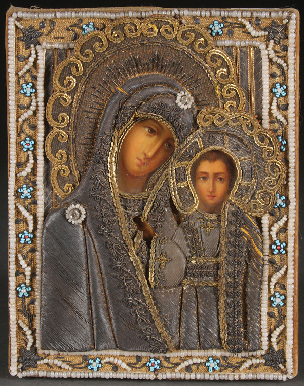 A RUSSIAN ICON OF THE KAZAN MOTHER OF GOD, 19TH CENTURY. Realistically rendered and overlaid with an ornate silver and gilt embroidered riza with paste stones and the borders beaded. 7.25 inches x 5.75 inches (18.5 x 14.5 cm).
