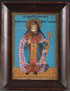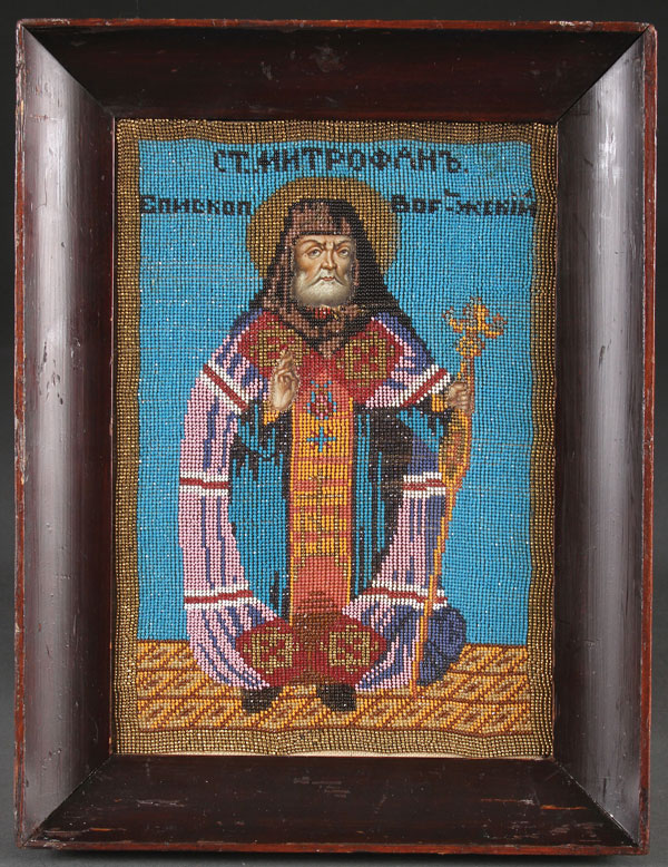 AN INTERESTING RUSSIAN ICON OF ST. METROPHAN OF VORONEZH, 19TH CENTURY. The face and hands realistically painted and the entire icon overlaid with a finely beaded riza and contained in a wood frame. Icon 9 inches x 6.5 inches (23 x 16 cm).