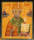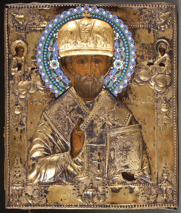 A RUSSIAN ICON OF ST. NICHOLAS, 19TH CENTURY. Overlaid with a gilded repoussé riza, with later attached cloisonné halo, probably silver but unmarked. Lifting paint. 11.25 inches x 9.5 inches (29 x 24.5 cm).