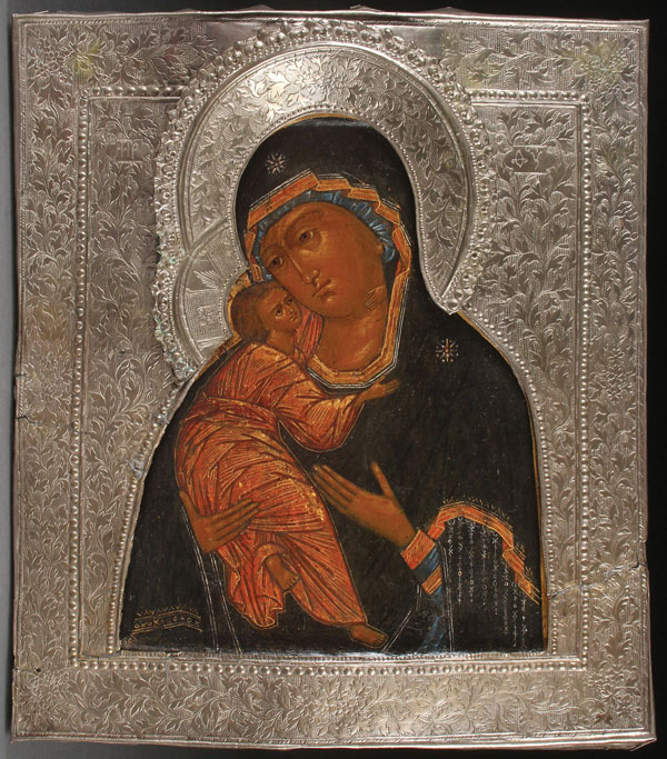 A RUSSIAN ICON OF THE VLADIMIR MOTHER OF GOD, 19TH CENTURY. Finely painted and drawing on 16th century models, exhibiting an old hand-written note adhered to the verso. The entire image overlaid with a plated metal riza. 12.5 inches x 11 inches (32 x 28.5 cm).