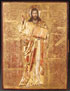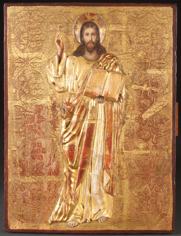 A UNIQUE ICON OF CHRIST, SOUTHWEST RUSSIA, 18TH CENTURY. Shown standing full length, the face and hands of Christ realistically rendered on an ornately incised gilt ground, the halo, garments, and feet of Christ carved in low relief of gilt gesso. Verso with a label of the "NARODHI GALERIE V PRAZE"—the National Gallery in Prague. 14 inches x 10.5 inches (35.5 x 26.5 cm).