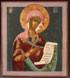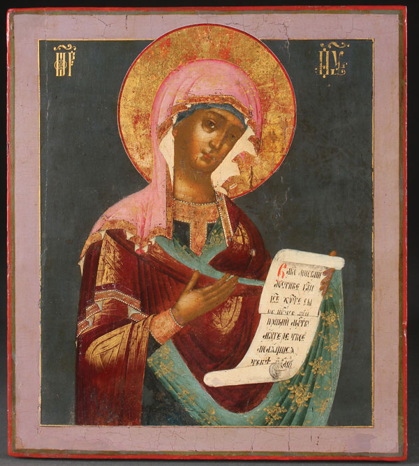 A FINE RUSSIAN ICON OF THE MOTHER OF GOD, MOSCOW, CIRCA 1800. Colorfully painted with gold highlights and echoing stylistic elements of the Armory School, here the Mother of God is shown turned inward toward Christ in an attitude of prayer, holding a scroll which begins, "Ruler most gracious, Lord Jesus Christ…." Probably once forming part of a three piece diesis grouping. 14.25 inches x 12.5 inches (36 x 32 cm).
