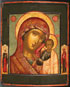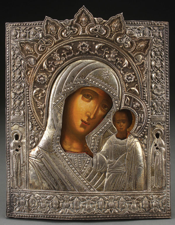 A VERY FINE RUSSIAN ICON OF THE KAZAN MOTHER OF GOD, MOSCOW, CIRCA 1750. Finely painted and with clear Armory School influence, the borders with the Holy Martyr Agripina and the Holy Martyr Tatiana. The entire image overlaid with a spectacular partial gilt silver, repoussé, and chased riza with attached halo. Apparently unmarked. 12.4 inches x 10.5 inches (31.5 x 27 cm).