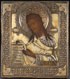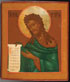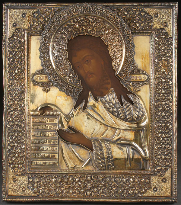 A FINE RUSSIAN ICON OF JOHN THE FORERUNNER, MOSCOW, CIRCA 1850. Here John is shown turned inward toward Christ in an attitude of prayer. He wears a hair shirt (vlasyanitsa) and holds an open scroll which begins, "Repent ye, for the Kingdom of God is at hand" (Matthew 3:2). Overlaid with a substantial gilded silver repoussé and chased riza with attached halo. Hallmarked Moscow, dated 1854, and with Cyrillic maker's mark "HFG." 14 inches x 12.5 inches (36 x 32 cm).