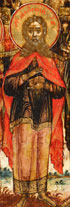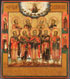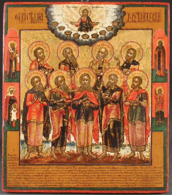 A VERY FINE AND INTERESTING OLD BELIEVERS RUSSIAN ICON OF THE NINE MARTYRS OF KYZIKOS, 18TH CENTURY. In this finely painted icon, the nine martyrs who died for their faith in the fourth century are depicted beneath an image of Christ who bestows the nine crowns of martyrdom on them. Within each halo is inscribed their Slavonic names, Theognes, Rufus, Antipater, Theostichus, Artemas, Magnus, Theodotus, Thaumasius, and Philemon. On the lower margin is a lengthy prayer from a “service” (Russian sluzhba) to the Nine Martyrs of Kyzikos. It begins, "Prayer to the Holy Nine Martyrs..." and it continues with: "O All-praised Holy Martyrs, valiant suffering servants of Christ Theognes, Rufus, Antipater, Theostichus, Artemas, Magnus, Theodotus, Thaumasius, and Philemon, who for Christ's sake...." etc. On the upper margin the subject is identified by the abbreviated inscription, IMAGE [OF THE] HOLY MARTYRS NINE THOSE AT KYZ-[IKOS]. The borders with family saints comprising the Bishop Saint John, the Venerable Paisius, Ulita and Kirik, and the Holy Female Martyr Antonina. The Nine Martyrs are commemorated on April 29. In an excellent state of preservation. 15 inches x 13.25 inches (38 x 33.5 cm).