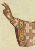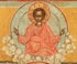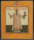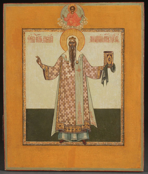 A VERY FINE RUSSIAN ICON OF THE METROPOLITAN ALEXEI, PALEKH, CIRCA 1800. A finely painted full length image of Alexei delivering a blessing and holding a jeweled book of Gospels. The kovcheg decorated in an ornate gilt pattern of scrolling foliage. In the upper margin with Christ Emmanuel in classical Palekh style clouds. The condensed and abbreviated head height inscription identifies the subject as the image of the "Holy Alexei Metropolitan of Moscow and all of Russia." 14.25 inches x 12 inches (36 x 30.5 cm).