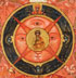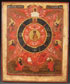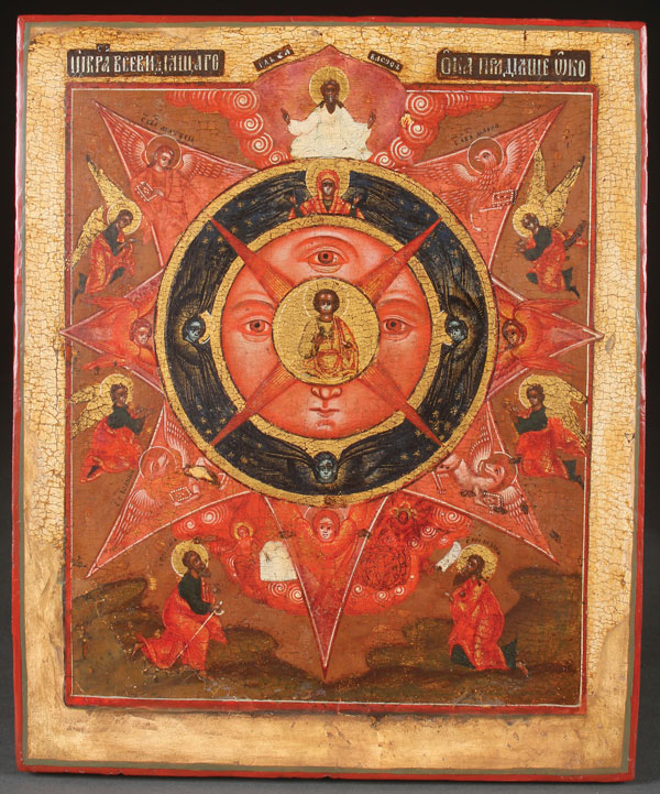 AN INTERESTING RUSSIAN ICON OF THE ALL-SEEING EYE OF GOD, 18TH CENTURY. At center is Christ as Emmanuel, the preexistent logos from which four star-like rays extend outward with the symbols of the four Evangelists at their terminating points. Along the lower margin are the Old Testament prophets Isaiah (left) and Ezekiel (right). 14.3 inches x 11.75 inches (36 x 30.5 cm).