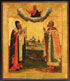 A RUSSIAN ICON OF ARSENY AND MIKHAIL OF TVER, 18TH CENTURY. At top center Christ delivers a blessing and below are two full-length figures each identified by the inscription above their heads as St. Aresny Bishop of Tver (left) and the Holy Prince Mikhail of Tver (right) and behind them the Zheltikov Monastery. 12.25 inches x 10.5 inches (31 x 26.5 cm).