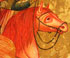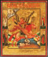 A FINE RUSSIAN ICON OF THE ARCHANGEL MIKHAIL, 19TH CENTURY. This popular image is based on the book of Revelation. Here the winged warrior rides atop a red winged horse holding a censer, book of Gospels and blowing a trumpet as he thrusts his lance into the abyss below. The border with family saints and the Guardian Angel. The upper margin inscribed with a condensed and abbreviated Slavonic text which reads," IMAGE OF THE HOLY ARCHANGEL MICHAEL COMMANDER OF THE VICTORIOUS POWERS" and the verso with faint old dedicatory inscription. 10.5 inches x 8.75 inches (26 x 22 cm).