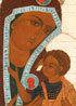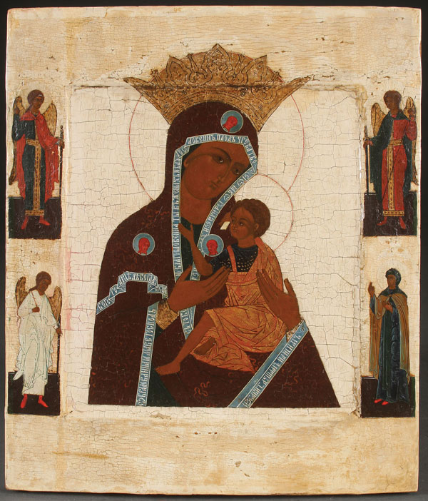 A RUSSIAN ICON OF THE O VSEPYETAYA MATI, 19TH CENTURY. The head covering of the Virgin edged with a wide band, containing in Slavonic, Kontakion 13 from the Akathist Canon, beginning, "O All-Hymned Mother…." The borders painted with Archangel Michael and Gabriel as well as the Guardian Angel and another saint. Probably an Old Believers workshop icon. 14.25 inches x 12.5 inches (36 x 31.5 cm).