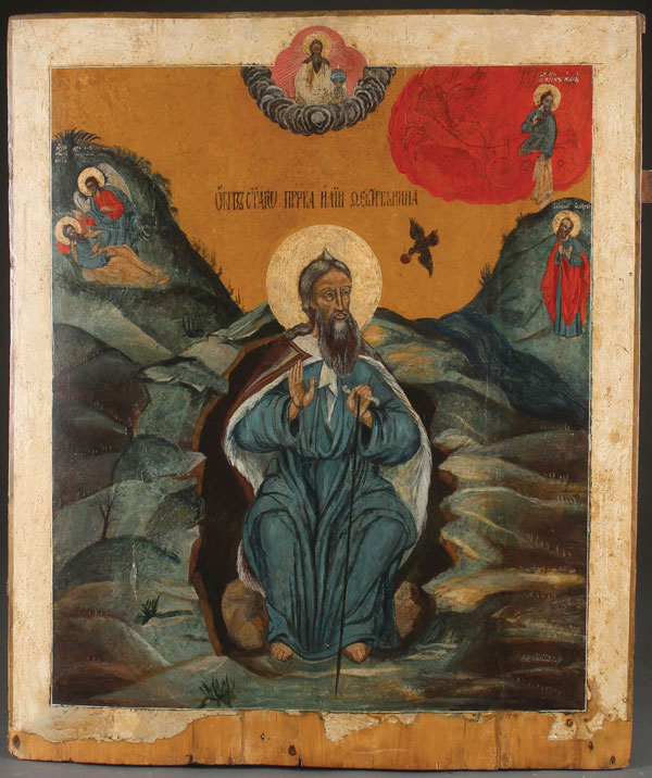 A LARGE RUSSIAN ICON OF THE PROPHET ELIJAH WITH LIFE SCENES, 18TH CENTURY. 37 inches x 31.5 inches (94 x 80 cm).