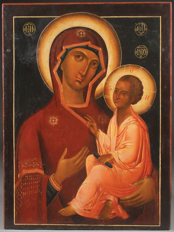 A LARGE RUSSIAN ICON OF THE TIKHVIN MOTHER OF GOD, 19TH CENTURY, PERHAPS SOUTHWEST RUSSIA. Here the mother of God gestures towards her son as the true source of salvation. The lower margin slightly reduced and thereby obliterating the inscription along the lower edge. 34 inches x 25.25 inches (86 x 64 cm).