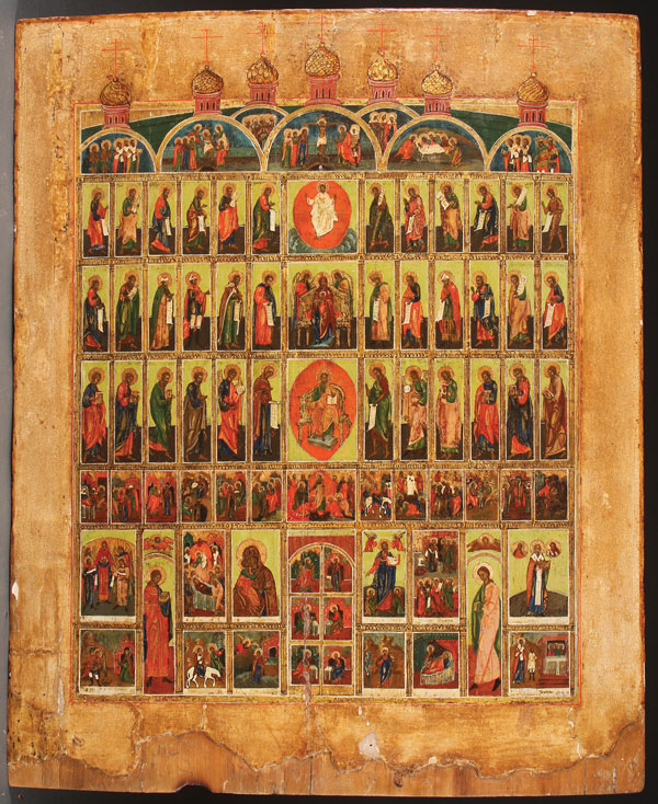 A LARGE RUSSIAN ICON OF AN ICONOSTASIS, 19TH CENTURY. Colorfully painted and depicting an extensive seven tiered iconostasis with later restorations. 28.25 inches x 23.25 inches (71.5 x 58.5 cm).