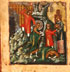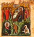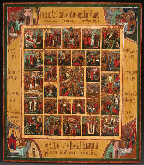 AN IMPRESSIVE RUSSIAN ICON OF THE RESURRECTION AND DESCENT, SCENES OF THE PASSION, AND CHURCH FEAST DAYS, PALEKH, 19TH CENTURY. Executed in the miniature technique, at center Christ descends into Hades, freeing from bondage all the righteous of the Old Testament, and above stands atop his empty grave (sarcophagus). Surrounding the central image are 12 smaller images depicting the Passion of Christ beginning with the Last Supper and concluding with the Placement in the Tomb. Further out still are 16 images representing the major Church Feast Days, each identified by a corresponding inscription. The corners painted with the four Evangelists and the panel constructed with a double kovcheg. Verso with a label of the NARODHI GALERIE V PRAZE - the National Gallery in Prague. 14 inches x 12 inches (35.5 x 31 cm).