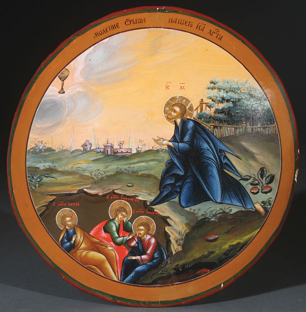 AN INTERESTING RUSSIAN ICON OF THE PRAYER OF THE CUP, 19TH CENTURY. This icon illustrates the story of Christ in the Garden of Gethsemane, known in the West as the "Agony in the Garden." As recorded in all four Gospels, immediately after the Last Supper, Jesus took a walk to pray in the Garden of Gethsemane with the Apostles Peter, James, and John. Here he is shown in prayer, while the Apostles 'a stone’s throw away' sleep as they cannot stay awake, 'The spirit is willing but the flesh is weak'. A cup (chalice) is depicted in the upper left corner related to the words spoken by Christ, 'If this cup cannot pass by, but I must drink it, your will be done' (Matthew 26:42). The upper border inscribed “The Prayer of the Cup of Our Lord Jesus Christ.” Diameter 10.25 inches (26 cm). (Unillustrated)