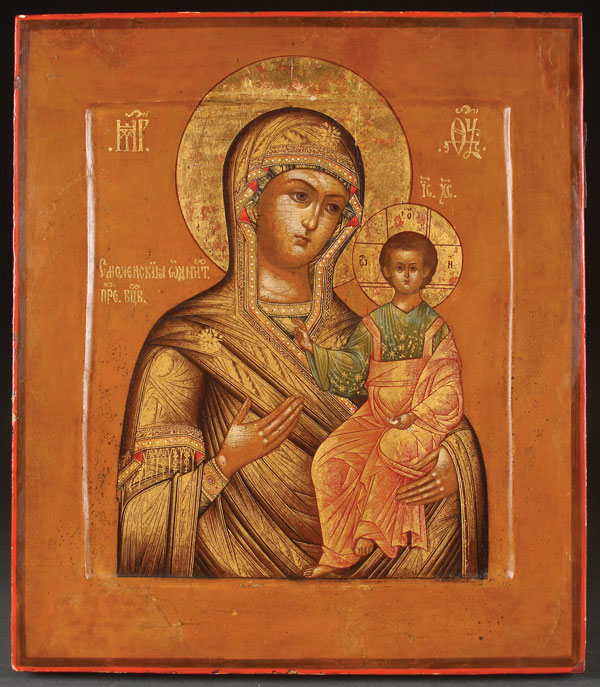 A FINE RUSSIAN ICON OF THE SMOLENSK MOTHER OF GOD, PROBABLY MOSCOW, CIRCA 1880. Finely painted in the traditional style with extensive use of chrysography. 14 inches x 12.25 inches (36 x 31 cm).