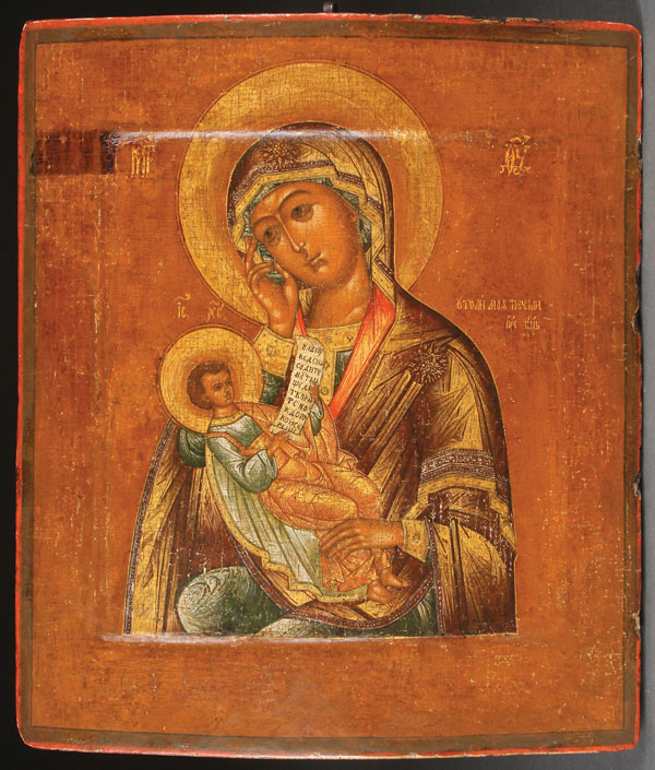 A RUSSIAN ICON OF THE MOTHER OF GOD SOOTHE MY SORROWS, PROBABLY PALEKH, 19TH CENTURY. Finely painted and with extensive use of gilt highlighting and shading. 12.25 inches x 10.5 inches (31 x 26.5 cm).