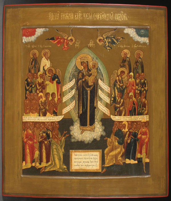 A VERY FINE RUSSIAN ICON OF THE MOTHER OF GOD JOY TO ALL WHO SORROW, MOSCOW, CIRCA 1900. Finely painted and reflecting stylistic elements similar to those icons produced in the workshops of Gurianov and Chirikov. 16.75 inches x 14.5 inches (42.5 x 37 cm).