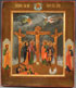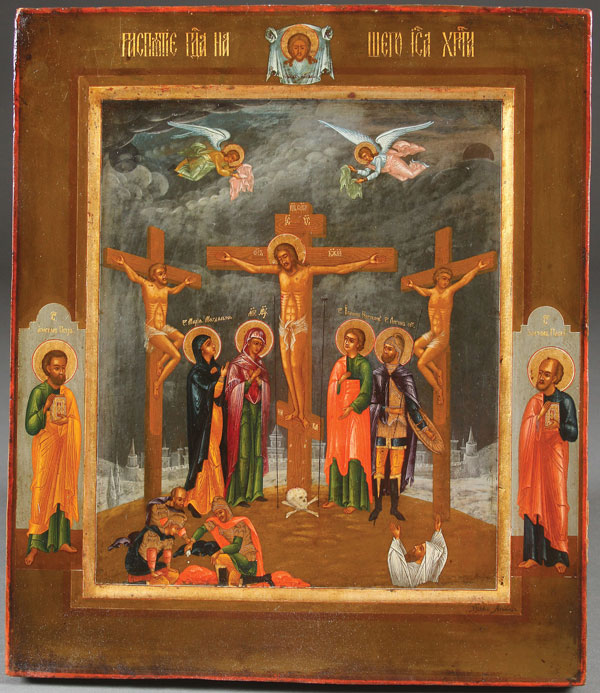 AN INTERESTING SIGNED RUSSIAN ICON OF THE CRUCIFIXION, FIRST HALF OF THE 20TH CENTURY. At center Christ depicted crucified upon a cross with the city walls of Jerusalem in the background. Above two angels of the Lord descend with cloths. On the left the “Good Thief” and on the right the “Bad Thief." Beneath the Lord on the left is the Mother of God and Mary Magdalene and on the right the Apostle John and the Roman centurion Longinus. In the lower left corner Roman soldiers cast dice for the robes of Christ. In the lower right corner a figure in a white burial shroud is depicted emerging from the ground representing one of the “saints” whose graves opened at the time of the earthquake during the crucifixion, as Jesus died, according to the narrative in Matthew 27:52, “Jesus, when he had cried again with a loud voice, yielded up the ghost. And, behold, the veil of the temple was rent in twain from the top to the bottom; and the earth did quake, and the rocks rent; and the graves were opened; and many bodies of the saints which slept arose, And came out of the graves after his Resurrection, and went into the Holy City, and appeared unto many." The upper margin painted with the Holy Visage and inscribed in Slavonic with gilt letters identifying the subject as “THE CRUCIFIXION OF OUR LORD JESUS CHRIST." The left border painted with the Apostle Peter and the right border St. Paul. The lower right corner signed in Cyrillic "Leonid" and date code for 1931. 14 inches x 12 inches (35.5 x 30.5 cm).