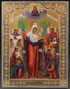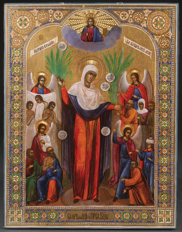 A RUSSIAN ICON OF THE MOTHER OF GOD JOY TO ALL WHO SORROW WITH COINS, CIRCA 1890. Colorfully painted and with the addition of five coins adhered to the surface. The borders intricately incised and decorated to simulate enameling. 17 inches x 13 inches (43.5 x 33.5 cm).