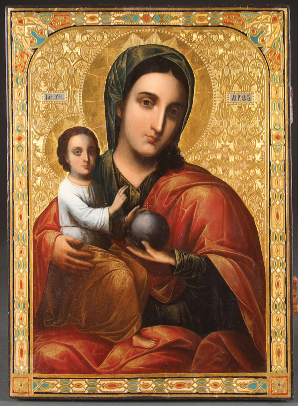A BEAUTIFUL RUSSIAN/UKRAINIAN ICON OF THE MOTHER OF GOD, CIRCA 1875. Finely painted in oil in the Western style against an ornately incised gilt ground, the Virgins and Christ child’s robes with gilt shading and highlights. The borders painted in faux enamel. In excellent condition. 16 inches x 11.6 inches (41 x 29.5 cm).