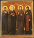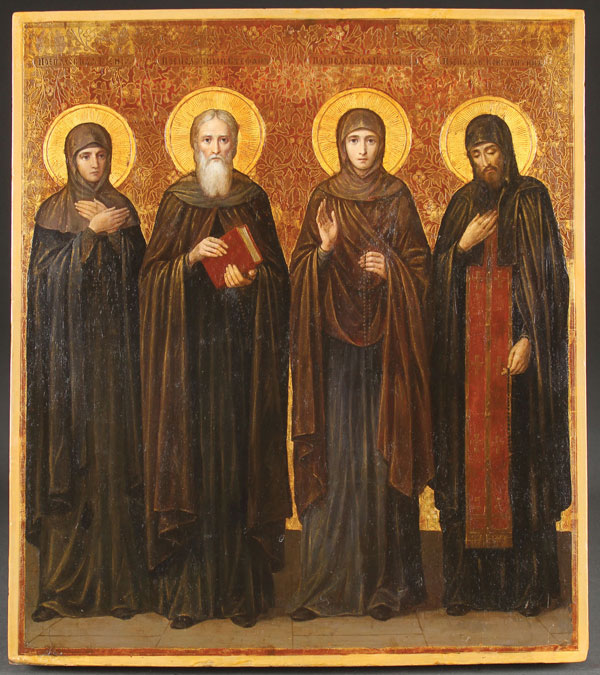 A RUSSIAN ICON OF FOUR MONASTIC SAINTS, CIRCA 1890. Each finely and realistically painted in monastic garb and each clearly identified by the name inscribed above their head beginning with the Venerable Xenia, the Venerable Stephan, the Venerable Paraskeva, and the Venerable Konstantin. Executed on a gilt ground with incised pattern of scrolling foliage and the garments with gilt highlights. 14.1 inches x 12.5 inches (36 x 32 cm).