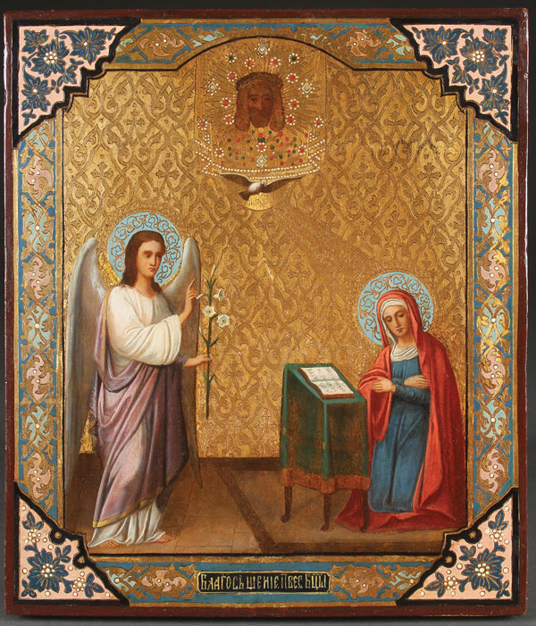 A RUSSIAN ICON OF THE ANNUNCIATION, CIRCA 1880. Naturalistically rendered within a shaped reserve on a gilt ground with incised strapwork design. At top center the Holy Visage and below a dove, symbol of the Holy Spirit, overshadows the Virgin Mary who kneels in prayer before the Archangel Gabriel at left. The borders ornately incised and painted to simulate enameling. The lower margin inscribed with the title. 14 inches x 12 inches (35.5 x 30.5 cm).