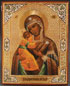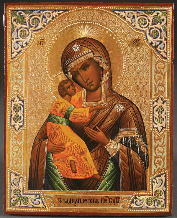 A RUSSIAN ICON OF THE VLADIMIR MOTHER OF GOD, CIRCA 1890. Finely painted on a heavily incised gilt ground with ornately decorated borders in faux enamel. 8.75 inches x 7 inches (22.5 x 8 cm).