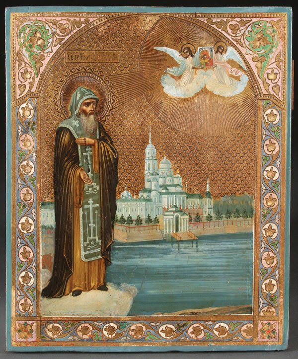 A RUSSIAN ICON OF ST. NIL STOLBENSKIY, CIRCA 1890. Painted in an arched reserve against a gilt incised background, here St. Nil, who died in 1554, is shown wearing the monastic habit called the Great Skema. In the upper right two angels hold aloft an icon of the Mother of God, and in the background is his island monastery. Nil takes his name from the Stolbensk Island in Lake Soliger where he lived. The borders ornately decorated in faux enameling. Such icons where often acquired by pilgrims who visited Nil's monastery and just as often they acquired there small carved figures of Nil resting on crutches. 10.5 inches x 8.75 inches (27 x 22 cm).