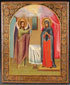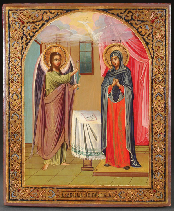 A RUSSIAN ICON OF THE ANNUNCIATION, D. L. LOGINOV, ST. PETERSBURG, CIRCA 1890. Colorfully painted within an arched reserve, here the Archangel Gabriel (left) announces to the Virgin Mary (right) that she will bear the Savior. The borders innately incised and painted to simulate cloisonné enamel. The verso with the Cyrillic workshop stamp of "D.L.Loginov," St. Petersburg. 10.6 inches x 8.75 inches (27 x 22 cm).