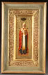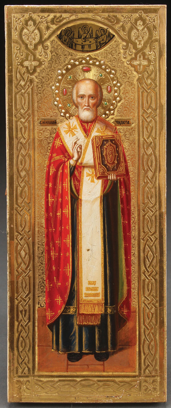 A FINE RUSSIAN ICON OF SAINT NICHOLAS, TRINITY SERGI LAVRA WORKSHOP, DATED 1897. A finely painted full length image of Nicholas who holds a book of Gospels and delivers a blessing beneath and image of the Old Testament Trinity, the namesake of the Lavra. The background and borders finely incised with strap work and scrolls. Verso of icon with stamp of the Trinity Sergi Lavra and price of six rubles, and with handwritten dedicatory inscription dated 1897. Size: 8.75 inches x 3.5 inches (22.5 x 9 cm). In excellent condition being contained in its original glazed frame (not shown).
