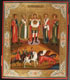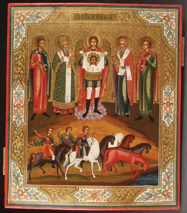 A RUSSIAN ICON OF SAINTS FLORUS AND LARUS, PALEKH, CIRCA 1900. At top center, the Archangel Michael (identified by the inscription on the upper margin) holds the Holy Visage, on his left are Saints Florus and the Bishop Saint Modest, on his right the Bishop Saint Vasiliy and Saint Larus. Below are depicted three riders chasing a herd of horses, their names are Spevsipp, Elevsipp, and Melevsipp, meaning "Horsebreaker," "Horse-Scout," and "Black Horse." With ornately incised gilt borders painted to simulate enameling. 12.25 inches x 10.4 inches (31 x 26.5 cm).