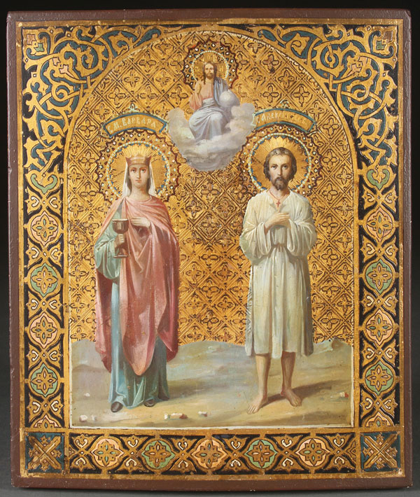 A RUSSIAN ICON OF SELECTED SAINTS, MOSCOW, CIRCA 1880. Painted against an incised gilt ground within an arched reserve, at top center, Christ delivers a blessing and below, full length images of St. Barbara (left) and St. Alexei Man of God (right). The borders intricately incised and painted to simulate cloisonné enamel. 12.5 inches x 10.5 inches (31.5 x 26.5 cm).