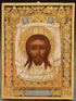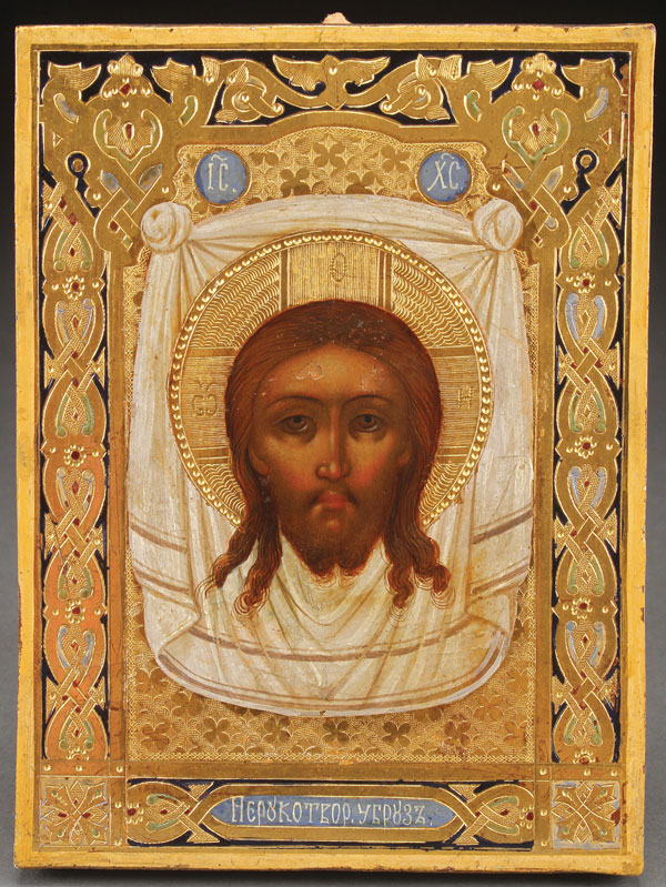 A RUSSIAN ICON OF THE HOLY VISAGE, TRINITY POSAD WORKSHOP, CIRCA 1890. Here the face of Christ is shown as it was miraculously transferred onto a cloth. Painted on an ornately incised gilt ground, the borders painted in faux enamel and the lower margin inscribed with the standard title for this image, “THE IMAGE NOT-BY-HANDS-MADE.” The verso with workshop stamp of the CRAFTSMAN OF THE TRINITY DISTRICT (КУСТАРНИКИ ТРОИЦКАГО ПОСАДА), and with the Imperial Warrant at center of stamp. 7 inches x 5.25 inches (18 x 13.3 cm).