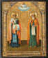 A RUSSIAN ICON OF ST. NICHOLAS AND THE PROPHET ELIJAH, CIRCA 1890. Both realistically rendered within an arched reserve on an incised gilt field, Christ delivers a blessing from top center, and the borders painted in faux enamel. 12.25 inches x 9.5 inches (31 x 24 cm).