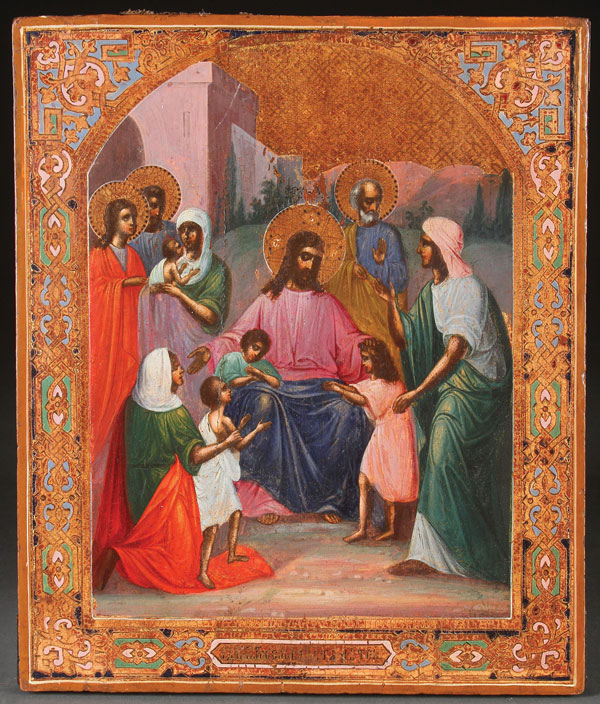 A RUSSIAN ICON OF CHRIST BLESSING THE CHILDREN, CIRCA 1890. Christ at center surrounded by children, mothers, and apostles. This icon illustrates the Gospel passage from Matthew 19:14. 12.4 inches x 10.5 inches (31.5 x 26.5 cm).