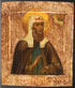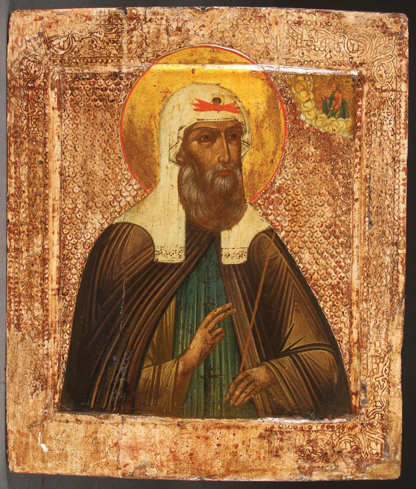 A RUSSIAN ICON OF SAINT ALEXIS OF MOSCOW, CIRCA 1890. In the upper corner Christ delivers a blessing, the background and borders cleaned down to the incised gessoed ground. 12.25 inches x 10.5 inches (31 x 26.5 cm).