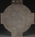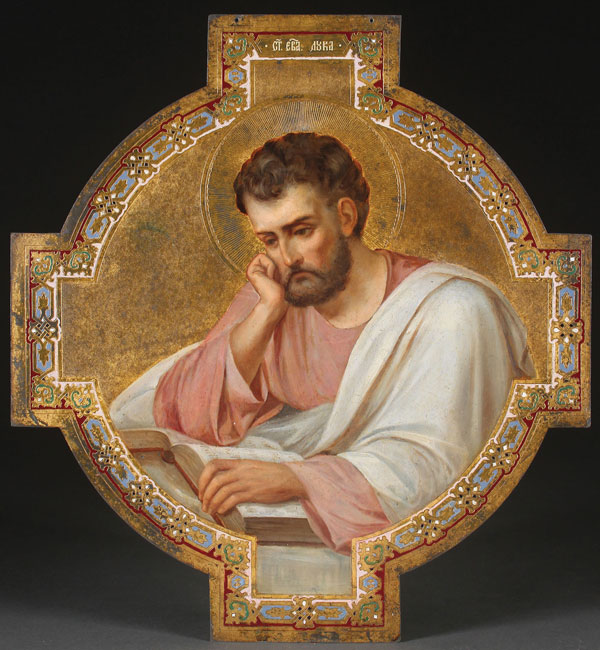 AN OVERSIZED RUSSIAN ICON OF THE EVANGELIST SAINT LUKE, CIRCA 1890. Executed on a large round cross-form metal support, with heavily incised borders and haloes and the background stippled. Here St. Luke is depicted contemplating his Gospels, and is identified by the inscription above his head. The background gilded and the borders finely painted to simulate cloisonné enameling. The size and shape of the offered lot would suggest that it was once part of a church interior, perhaps on the Royal Doors. Verso with indecipherable inscription including the word “Wiesbaden” or Baden Baden perhaps related to the Russian Orthodox Church dedicated to St. Elizabeth in Wiesbaden or the Russian Orthodox Church of the Transfiguration located in Baden-Baden (see lot 479). 21 inches x 19.3 inches (53.5 x 49 cm).