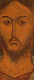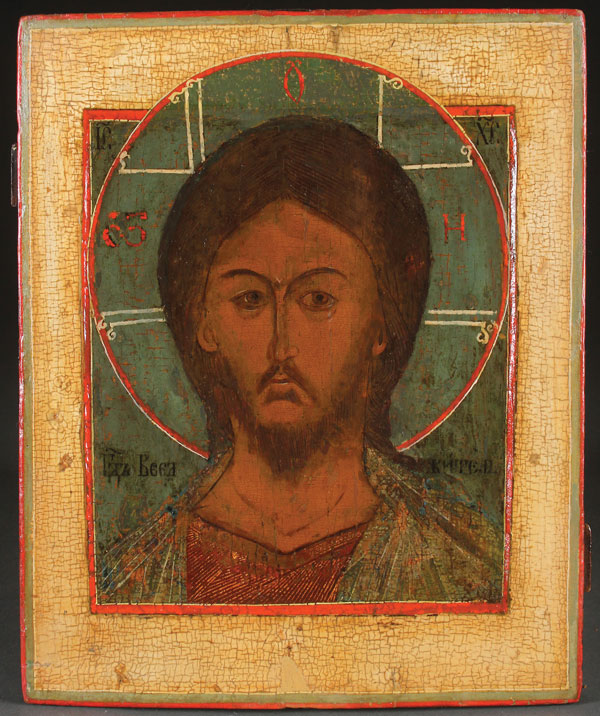A RUSSIAN ICON OF CHRIST, PROBABLY 17TH CENTURY WITH LATER RESTORATIONS. Here depicted in bust portrait style, executed on a green background, and identified by the shoulder height inscription, "The Lord Almighty." The borders cleaned down to the gesso. 12.5 inches x 10.25 inches (31.5 x 26 cm).